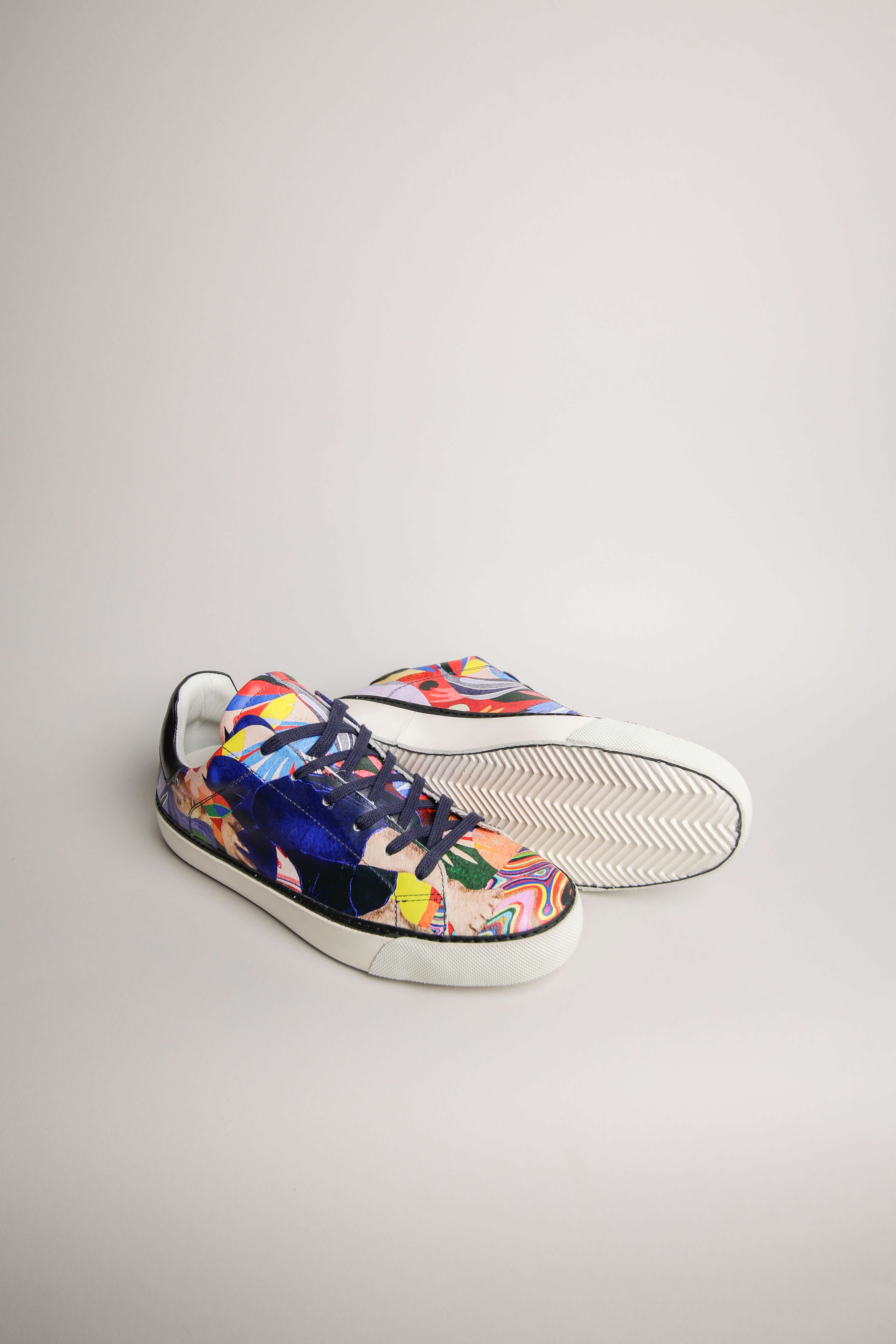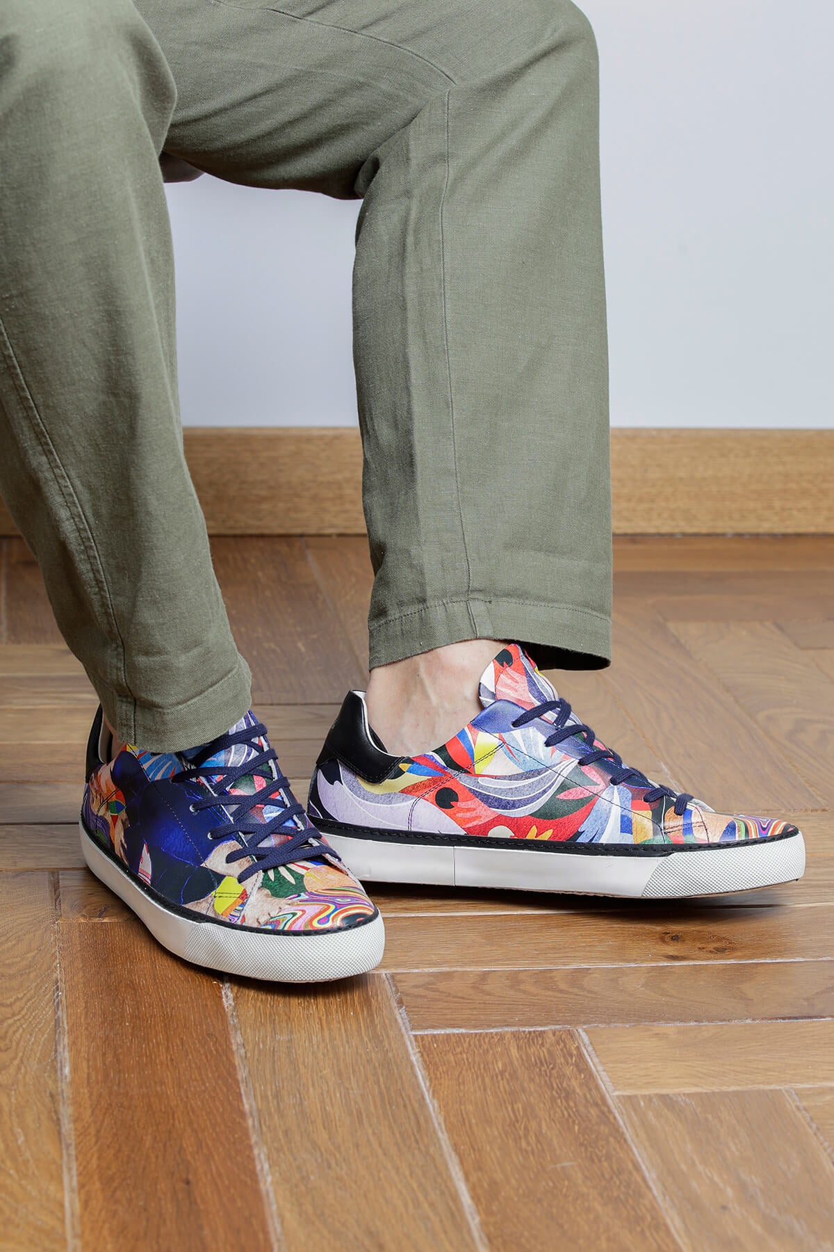 The Zero to One model is a visual explosion of color, symbolism, and layered imagination. Featuring an upper entirely covered in a vibrant, collage-like artwork—complete with surreal figures, bold shapes, and rainbow accents—it tells a story of transformation and possibility. Finished with a clean white sole and dark laces, this sneaker is not just a design, but a declaration: creativity starts with a single step.