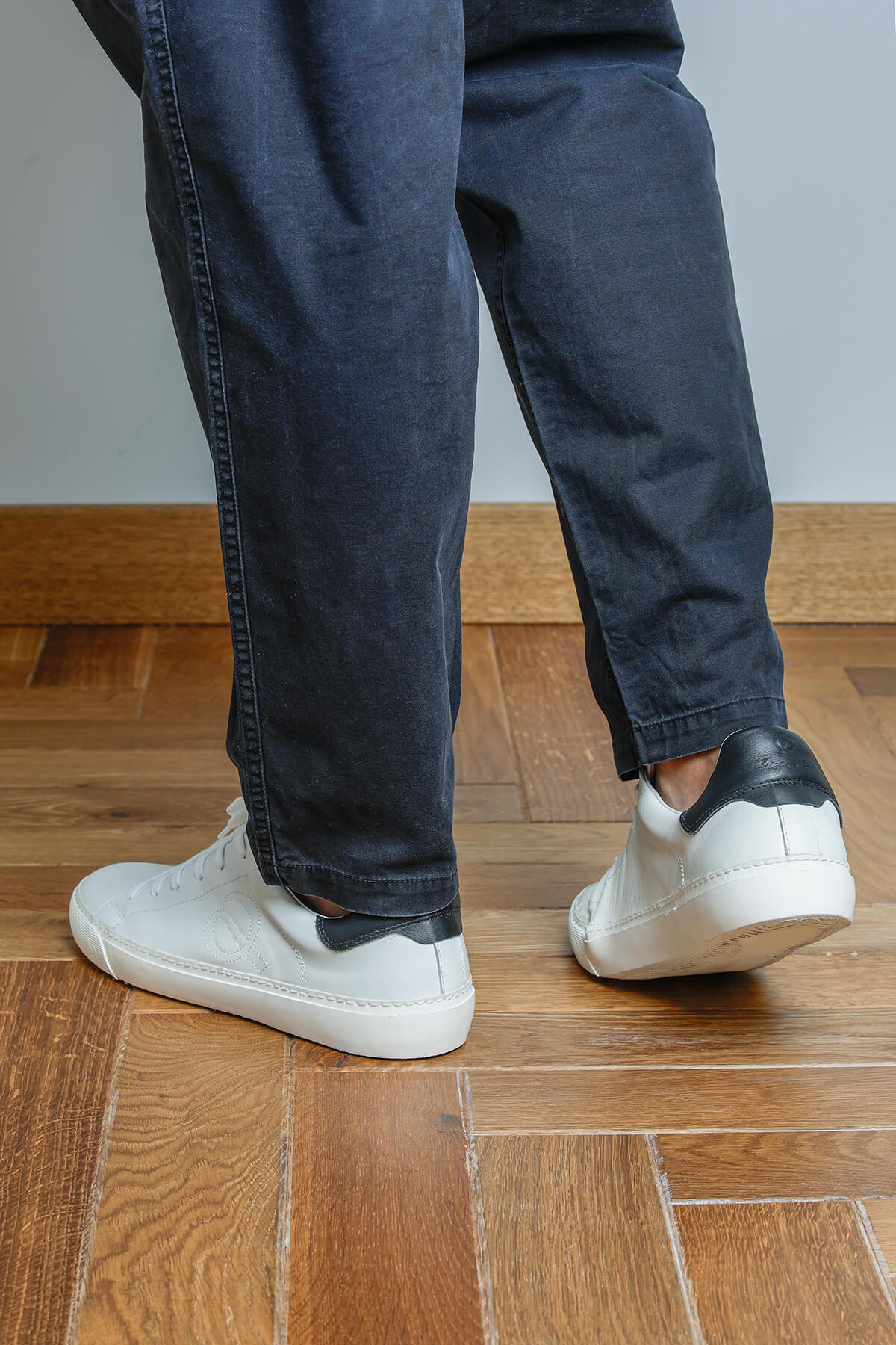 This sneaker pairs the softness of white goat leather with a clean, minimalist silhouette. The contrast black spoiler adds a bold finishing touch to the understated upper, while the natural texture ensures a luxurious feel. Designed for those who appreciate quiet details with graphic impact.