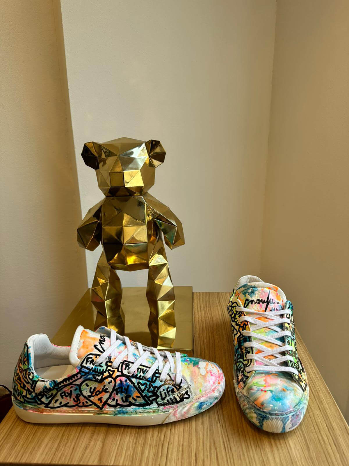 In Venice, Italian artisans craft the blank canvas: sneakers cut, sewn, and finished by hand from the finest leather. In Paris, Anoufa transforms each pair with his signature visual language — a fusion of pop symbolism and human emotion.
